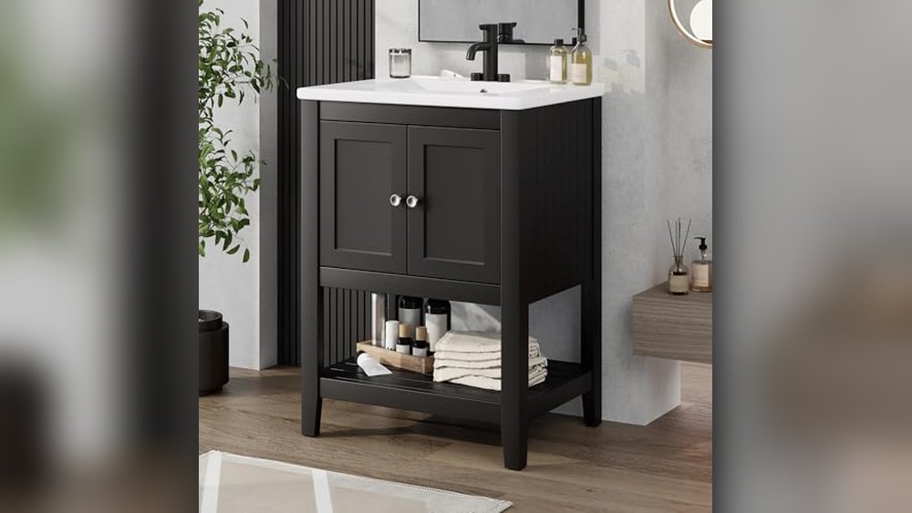 The Merax 24″ Bathroom Vanity is designed for small bathrooms that need both style and function. It features a solid wood frame and a ceramic sink with an elegant half-moon shape, helping to maximize sink space in compact areas. This vanity also has soft-closing doors and adjustable shelves for practical storage in tight spaces.