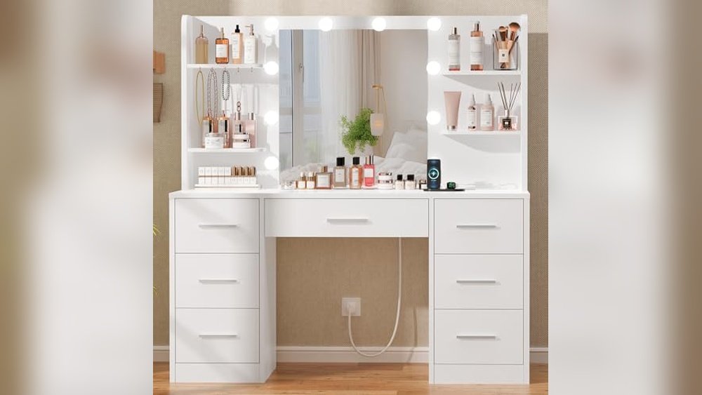 This vanity desk is perfect for anyone with limited space who still wants a full-featured makeup station. It removes the hassle of finding outlets and lighting by integrating them directly into the design. To get the best results, position it near a natural light source and use the adjustable LED modes for makeup accuracy.