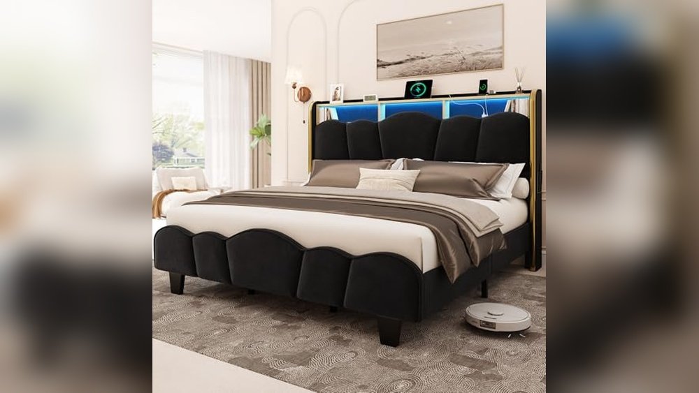 Using this bed frame feels efficient and comfortable thanks to its sturdy build and thoughtful storage options like fabric drawers and shelves integrated into the headboard. Couples will appreciate the convenience of charging multiple devices at once and setting the mood with customizable LED lighting.