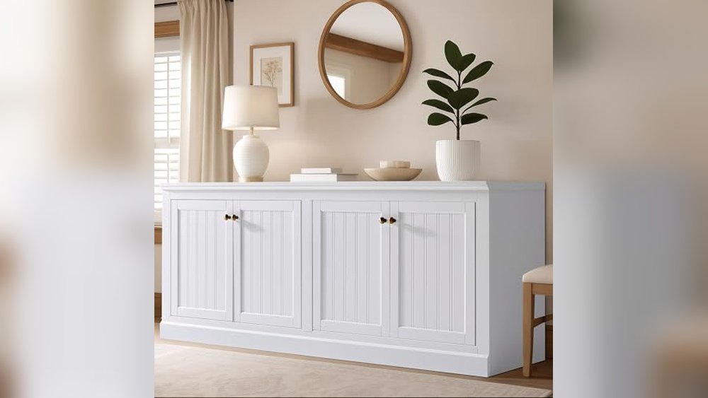 The Tribesigns Sideboard Buffet is a large storage cabinet designed with adjustable shelves and four compartments to help organize your living room or dining area efficiently. Its built-in rebound door design reduces accidental bumps, making it a practical choice for busy households.