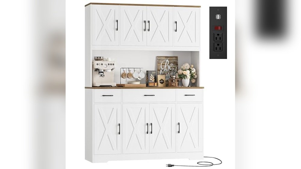 This tall kitchen pantry hutch from HOSTACK combines storage with functionality, solving the challenge of organizing kitchen essentials in one compact unit. It features glass doors, a wine rack, and a built-in charging station to keep your devices powered while saving counter space.
