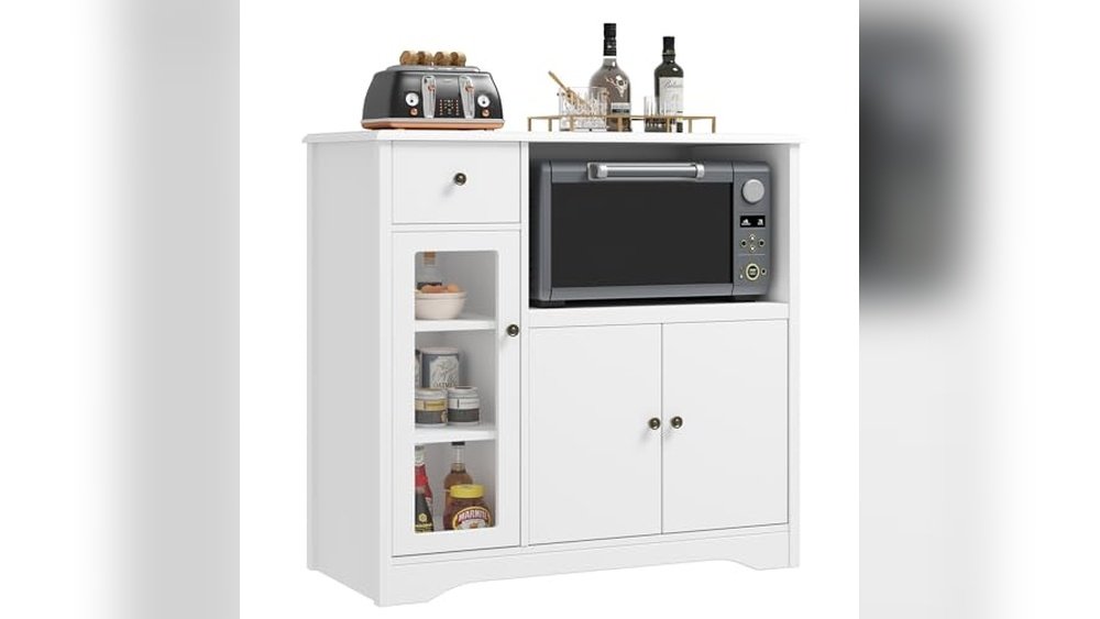 The HORSTORS Microwave Cabinet is an ideal Best Compact Buffet Cabinet for Apartments, offering multifunctional storage and space-saving design for small kitchens.