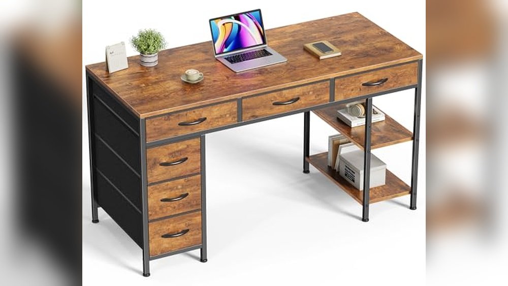 This 47-inch computer desk by Korfile combines workspace and storage with five fabric drawers and a monitor stand to keep your setup organized. It includes three power outlets and two USB charging ports, which simplifies powering your devices without extra cables cluttering the desk.