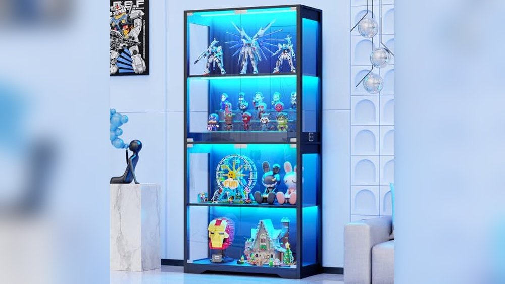 Using this cabinet means your collectibles remain visible and protected with a clear glass door and built-in 3-color LED lights that turn on automatically as you approach. This smart lighting setup enhances your display’s visibility while saving energy and effort.