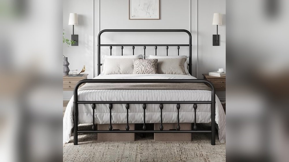 The Yaheetech Victorian Metal Bed Frame offers a sturdy foundation for your mattress with a classic farmhouse style. This metal frame eliminates the need for a box spring while providing under-bed storage space, helping solve clutter and support issues in one.