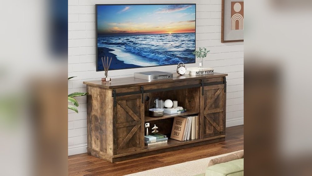 This TV stand is best for those who want a rustic farmhouse style in their living room without sacrificing storage space. It removes the guesswork of fitting large TVs and organizing media components with adjustable shelves and sliding doors. For best results, measure your room and devices carefully to ensure a proper fit.