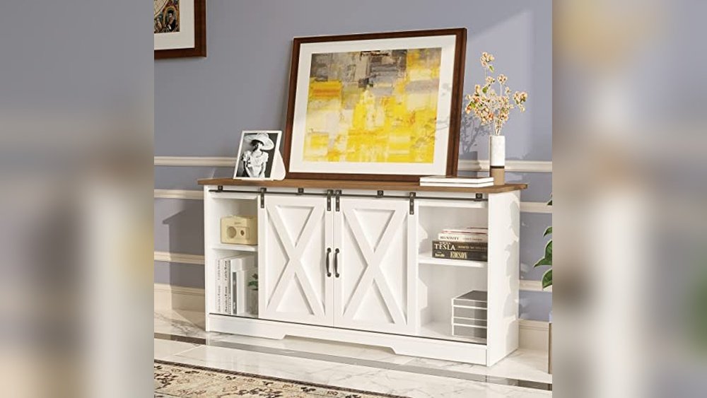 This Best Farmhouse Tv Stand With Storage Cabinets offers ample adjustable storage and a classic sliding barn door design for organized living spaces.