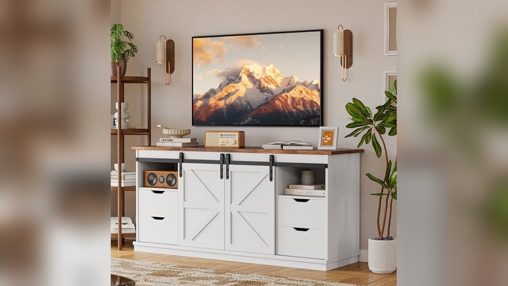 This Best Farmhouse Tv Stand With Storage offers ample drawer space and sliding barn doors to keep your living room neat and stylish.