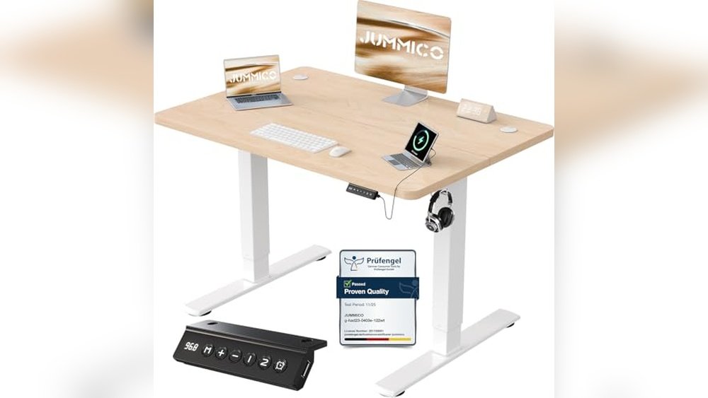 The JUMMICO Adjustable Standing Desk is designed to help reduce discomfort from long hours of sitting by allowing seamless height adjustments between 73 and 118 cm. It features a sturdy metal frame and a smart panel with USB charging and memory functions to improve your office or gaming setup.
