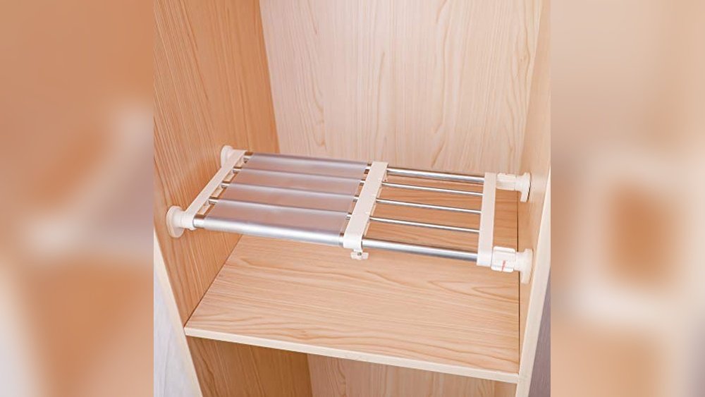 The Hershii Adjustable Tension Shelf is a metal organizer designed to fit inside cabinets, wardrobes, and other spaces without the need for tools. Its telescopic design allows adjustment between 15.74 and 23.62 inches, making it suitable for various storage needs while saving space.