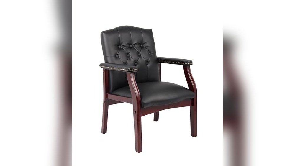 The Boss Traditional Vinyl Guest Chair offers a practical seating solution for executive offices and home workspaces. Its cushioned seat and back with classic tufting and nail head details create a refined look while providing comfortable support for guests. The sturdy mahogany wood base adds stability and complements traditional office decor.