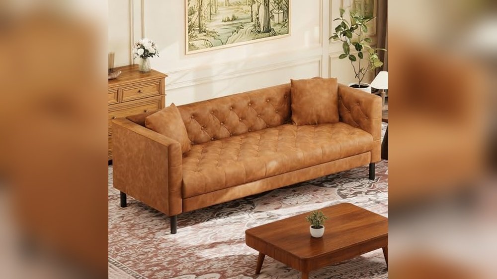 This Kingfun sofa stands out as the Best Leather Sofa for Durability with its solid iron frame and premium faux leather build that supports long-term use.