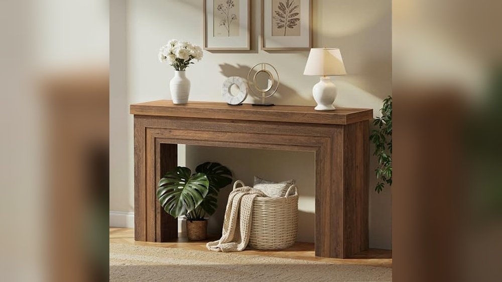 This farmhouse console table by Tribesigns is designed to fit narrow spaces while providing ample two-tier storage for organization. Its unique trapezoid shape and sturdy wooden build bring rustic charm and practical use to your hallway or behind your sofa.