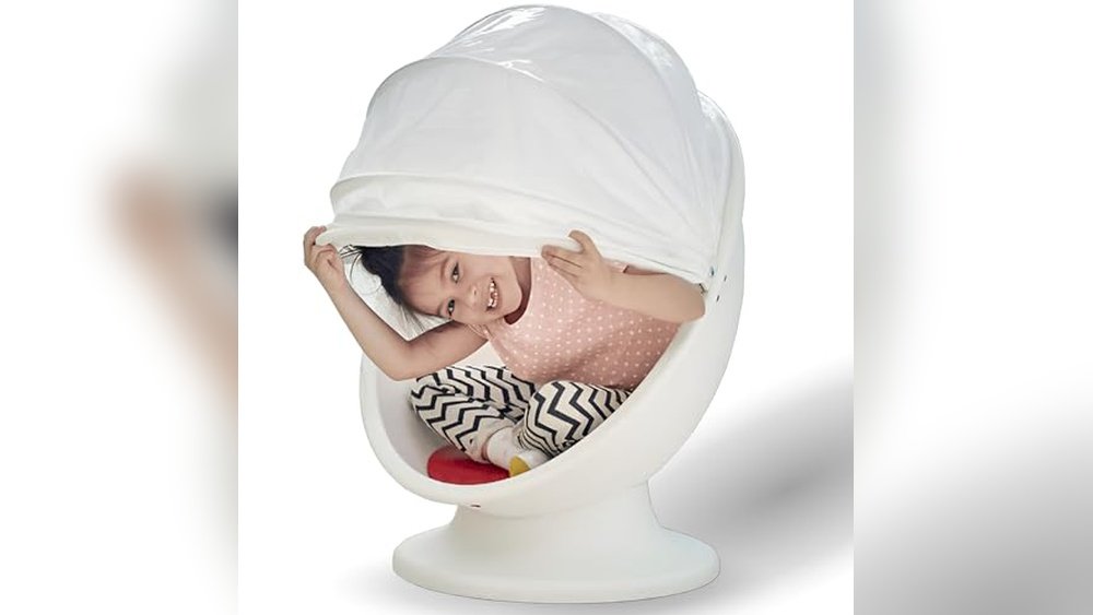 This swivel chair is designed specifically for kids, combining fun with safety. It features a spinning seat that helps develop physical coordination and brain functions while also transforming into a cozy hiding spot with a pull-down hood that lets in filtered light.
