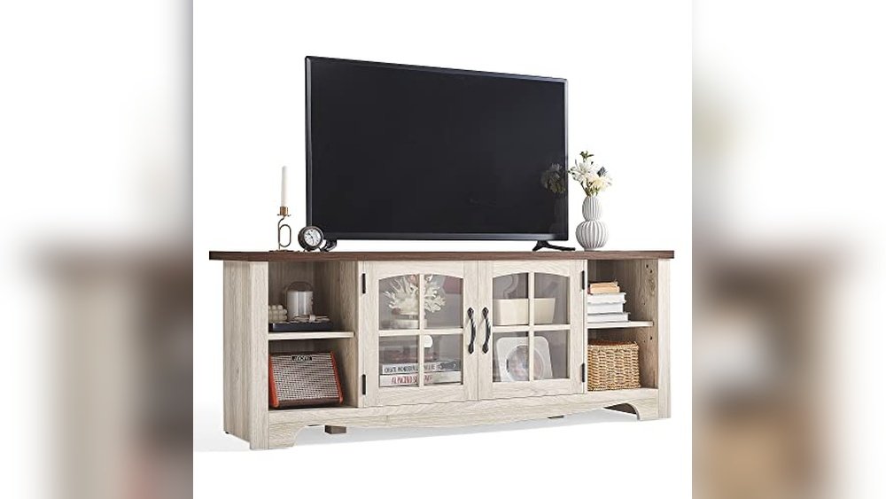 For those seeking the best TV cabinet with doors that adds warmth and storage to living spaces, this TV stand suits farmhouse and rustic home lovers.