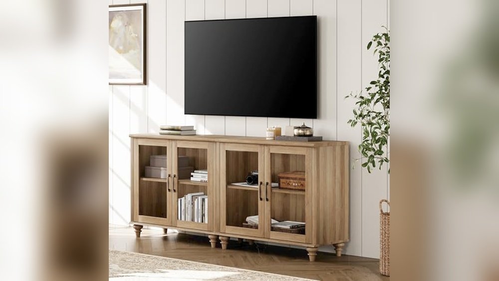 For those looking for the best TV cabinet with glass doors that combines vintage style and practical storage, this AMERLIFE farmhouse sideboard fits well in living rooms and dining areas.