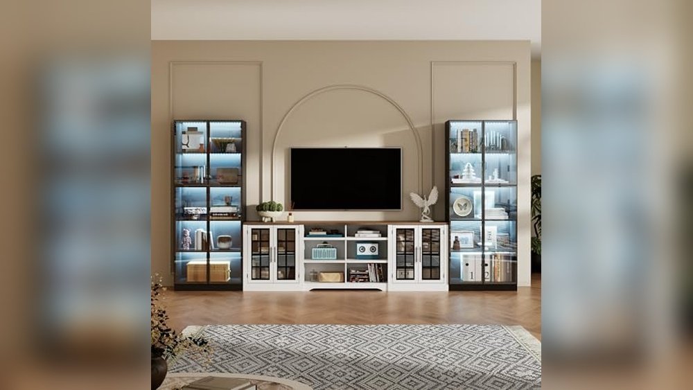 This farmhouse-style TV stand combines a wide console with two LED display cabinets, offering multiple compartments for both storage and decoration. It solves the challenge of keeping living spaces tidy while showcasing collectibles or media gear. The glass doors with adjustable compartments stand out, allowing customization of the interior layout to fit different items.