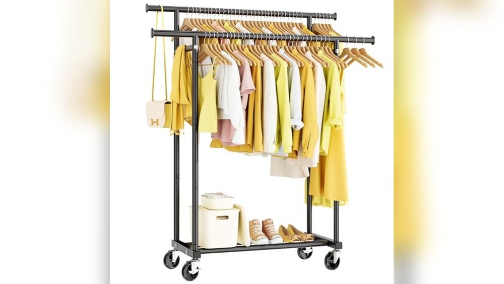 The HYSEYY Double Rod Clothes Rack is a portable wardrobe designed to organize clothes with its dual-rod layout and side extension rods, providing flexible storage for various items. Its heavy-duty steel construction supports a large load, making it ideal for those needing a durable garment rack.
